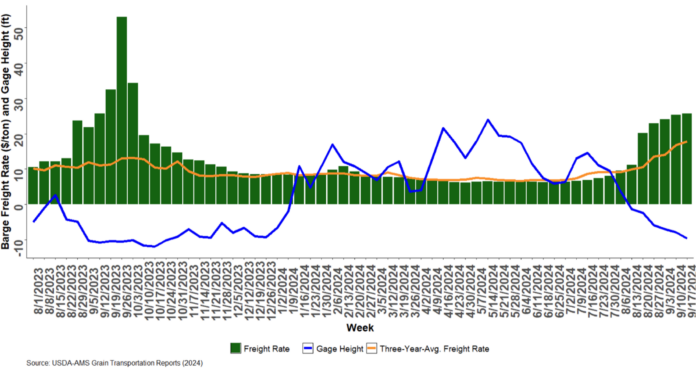 Figure 1 plots the Mississippi River level measured at Memphis, Tennessee, for the period Aug. 1, 2023, through Sept. 3, 2024. This figure also provides the weekly average freight, as well as the expected barge freight rate measured by the non-drought three-year average freight rate (i.e., 2019-2021). As the gage height falls, barge freight rates increase, and vice versa.