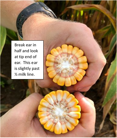 At ¾ milk line, the starch line has moved about ¾ distance down the kernel towards the cob. When the milk line is no longer visible, a dark brown or black layer of cells forms to separate the kernel from the cob, hence the term “black layer.”