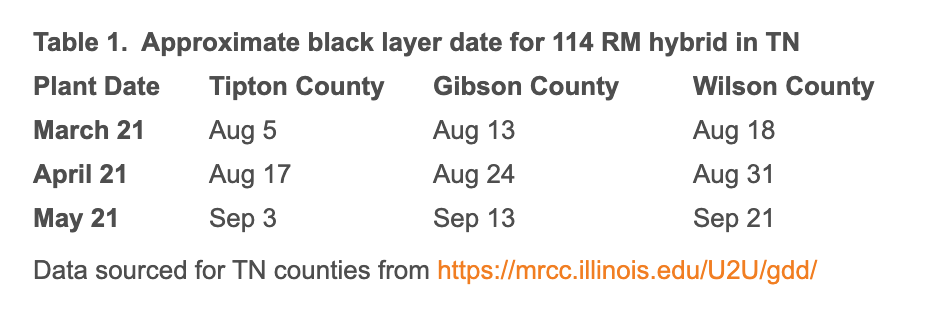 Achieving physiological maturity (R6 or black layer) is the first step towards corn dry down and harvest. The date at which corn black layer forms depends on planting date, relative maturity of hybrid and, to some extent, planting location in Tennessee.