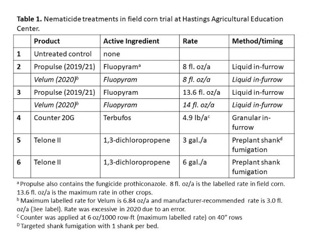 Plant-parasitic nematodes can substantially reduce yield in field corn. Crop rotation and nematicide application are the main options for managing nematodes in corn. Among nematicides, historically a single product, Counter (active ingredient terbufos), has been the primary option for most growers. With new fluopyram-containing products (Velum and Propulse) becoming available in recent years, a multi-year study was conducted to compare efficacy of new and old nematicide products for nematode management in field corn production.