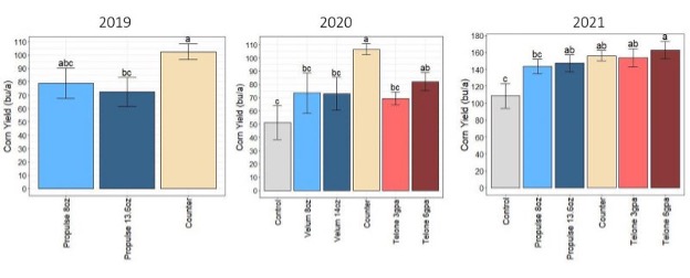 Plant-parasitic nematodes clearly affected corn productivity each year the trial was conducted, as visual symptoms were apparent during the season (Figure 1). Similarly, nematicide treatments affected crop yield each year (Figure 2). In 2019, corn yield was greater for Counter than either rate of Propulse, with an increase of about 40 bushels/acre. In 2020, when all treatments were assessed, Counter was also the top-yielding treatment by about 30 bushels/acre and had double the yield of untreated control. All other treatments increased yield numerically from control in 2020, but only Telone at 6 gallons/acre produced a statistically significant yield increase (other than Counter). In 2021, all products numerically increased yield (30-40 bushels/acre), although Propulse at 8 fluid ounces/acre had statistically similar yield to untreated control.