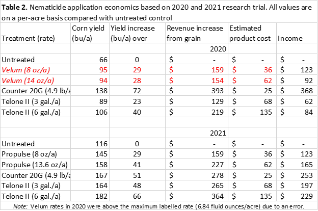 Examining basic economics (Table 2), any of the products tested are likely to provide a return on investment using current estimates of product costs and corn grain prices. Counter provided the best economic return on investment, largely because it produced the best overall yield. Extra costs of nematicide application, aside from product cost, were not included in calculations and Telone fumigation has the largest cost as an extra pass with specialized equipment would be needed for that product. Obviously, these returns are not guaranteed. In particular, these trials were conducted under severe pressure from nematodes and yield return when applying nematicides would likely be less when nematode pressure is lower.