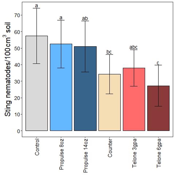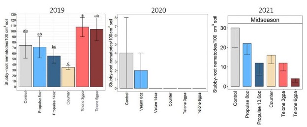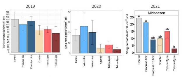 Yield response is the most important assessment of a nematicide’s efficacy, impacts on nematode populations help confirm that yield benefits were due to nematode control. If nematicide efficacy varies by nematode, it can also provide guidance regarding in which situations (types of nematodes present) a product is likely to be effective. In this study, sting nematode was the primary target nematode and Counter or Telone generally provided the best control of sting nematode populations. In both 2019 and 2020, nematicide treatments did not significantly affect sting nematode soil populations at midseason (Figure 3), but populations tended to be lower for Counter and Telone treatments than control or Propulse/Velum. In 2021, sting nematode populations were lowest with Telone at 6 gallons/acre, intermediate with Telone at 3 gallons/acre, Counter, or Propulse at 13.6 fluid ounces/acre, and greatest for Propulse at 8 fluid ounces/acre or untreated control. Averaged across years (Figure 4), only Counter or Telone at 6 gallons/acre significantly reduced sting nematode populations compared with untreated control.