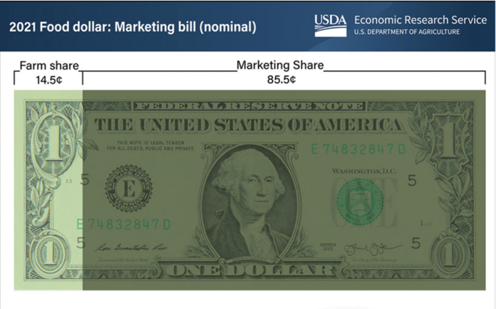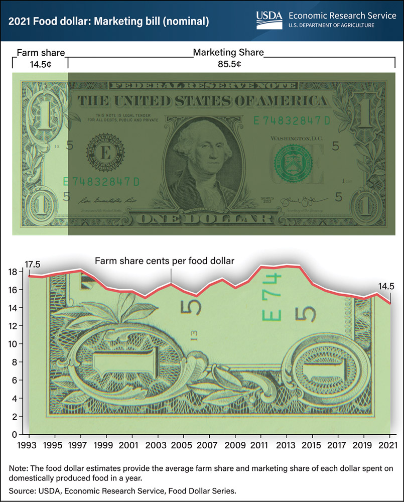 United States farm establishments received 14.5 cents per dollar spent on domestically produced food in 2021—a decrease of one cent from 15.5 cents in 2020—to the lowest recorded farm share value in nearly three decades. The remaining portion of the food dollar, known as the marketing share, covers the costs of getting domestically produced food from farms to points of purchase, including costs related to packaging, transporting, processing and selling to consumers.